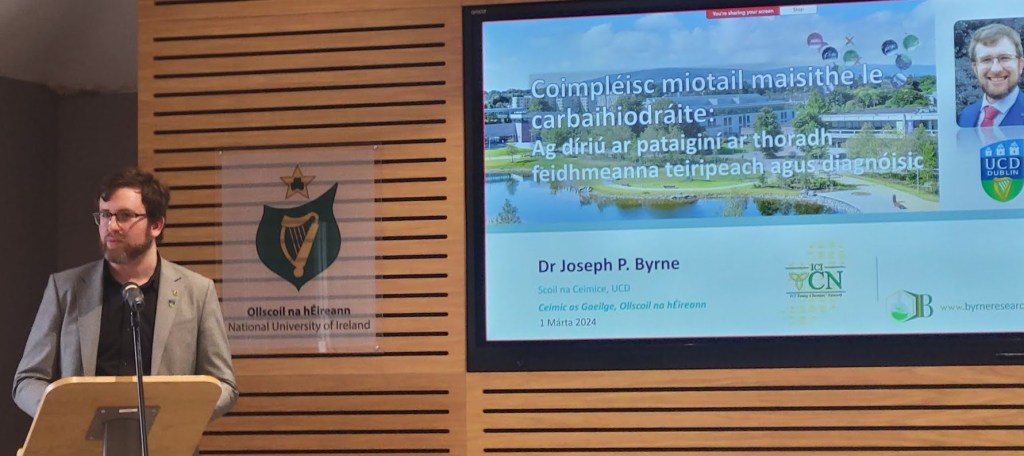 Labhair An Dr Iósaf Ó Beirne (COBÁC) faoin taighde atá ar siúil sa ghrúpa ‘s aige le coimpléisc miotail maisithe le carbaihiodráite. I gcomhthéacs an dúshlán frithsheasmhachta in aghaidh ábhar frithmhiocróbach, tá siad ag iarradh dhíriú ar pataiginí i mbealach nua, ina bhaintear feidhm as prótéiní áirthe a nascann le carbaihiodráite (ar a ghlaotar ‘leictiní’). Rinne Joe cur síos ar dhá sort glicea-bhraisle miotal-lárnach, bunaithe ar scafall btp (2,6-bis(1,2,3-tríasól-4-il)piridín) nó dpa (2,6-décarbocsaipiridín). Bhí éiféacht frith-bhithsceo ag coimpléisc btp Ru(II) nach raibh le fáil leis an liogann amháin – in aineoinn go raibh siad neamh-bhaictéiricídeach. Rinneadh réimse coimpléisc dpa le miotail éagsúla, ach bhí an éifeacht is mó frith-Pseudomonas aeruginosa ag coimpléisc eorapiaim(III). Léirigh sé fresin an féidireacht a bhí ag coimpléisc galachtósíde Tb(III) (le spáisire oiriúnach) mar braiteora leictiní lonnrachta, a éirigh níos gile nuair a bhí leictin a nascann galachtós ann.