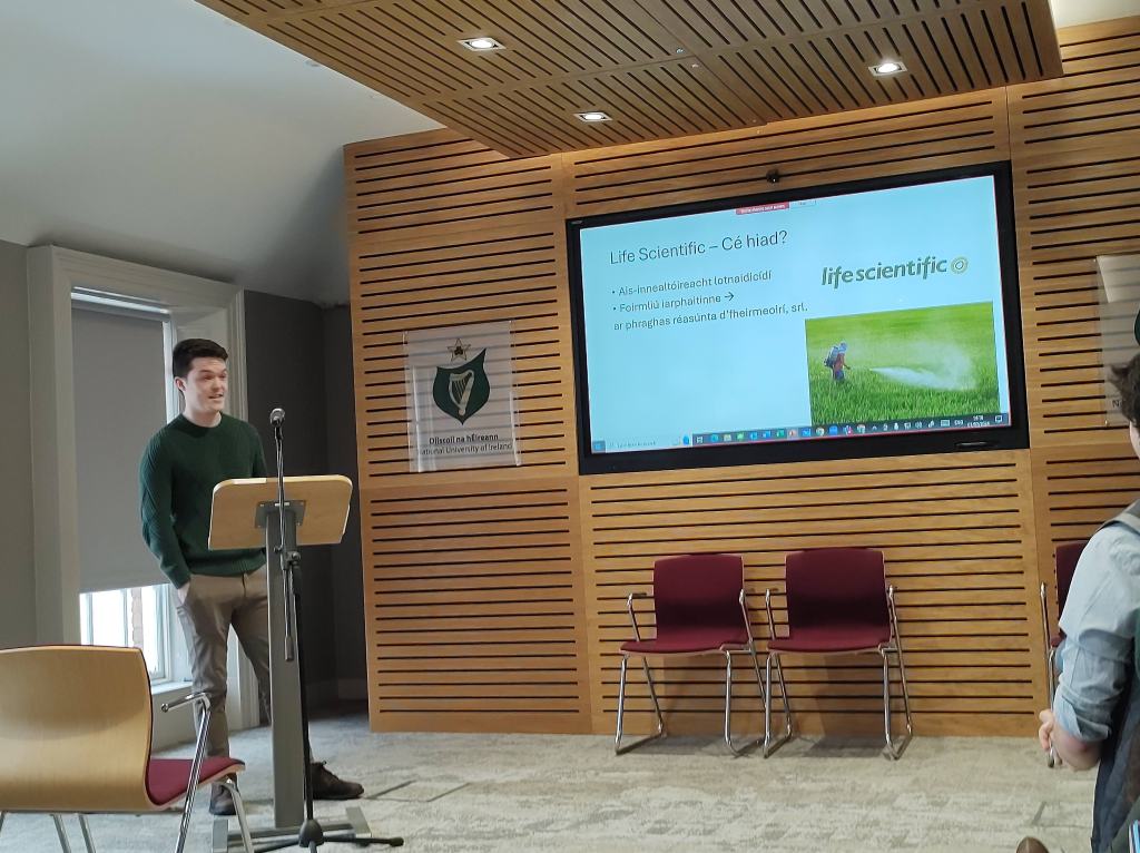 D’eagraigh Joe agus Cathal Kelly imeacht á phlé cúrsaí thaighde ceimice trí mheáin na Gaeilge. | Joe and Cathal Kelly organised an event discussing chemical research through the medium of the Irish language.