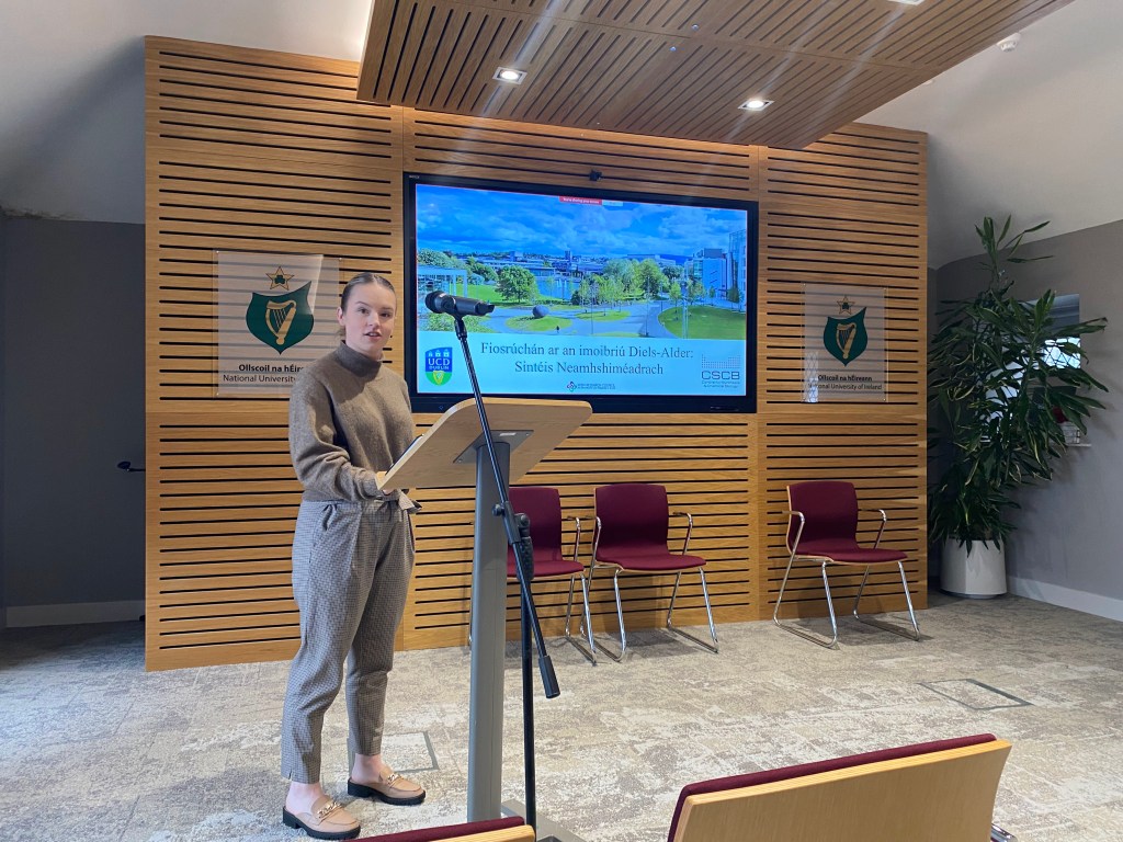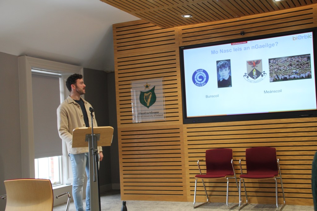 Dr Patrick O’Leary, Registrar of NUI, formally welcomed delegates to the venue. He said NUI was delighted to host the event, adding “Our strategic plan commits us to  developing our abilities in Irish and to supporting events like this.” Until a few years ago, Dr O’Leary was a chemistry lecturer in University of Galway, and he took the opportunity to participate in the conference, presenting research on the synthesis of new catalysts.  These catalysts are used in reactions that are important for pharmaceutical preparation.  They make the reactions more efficient and reliable