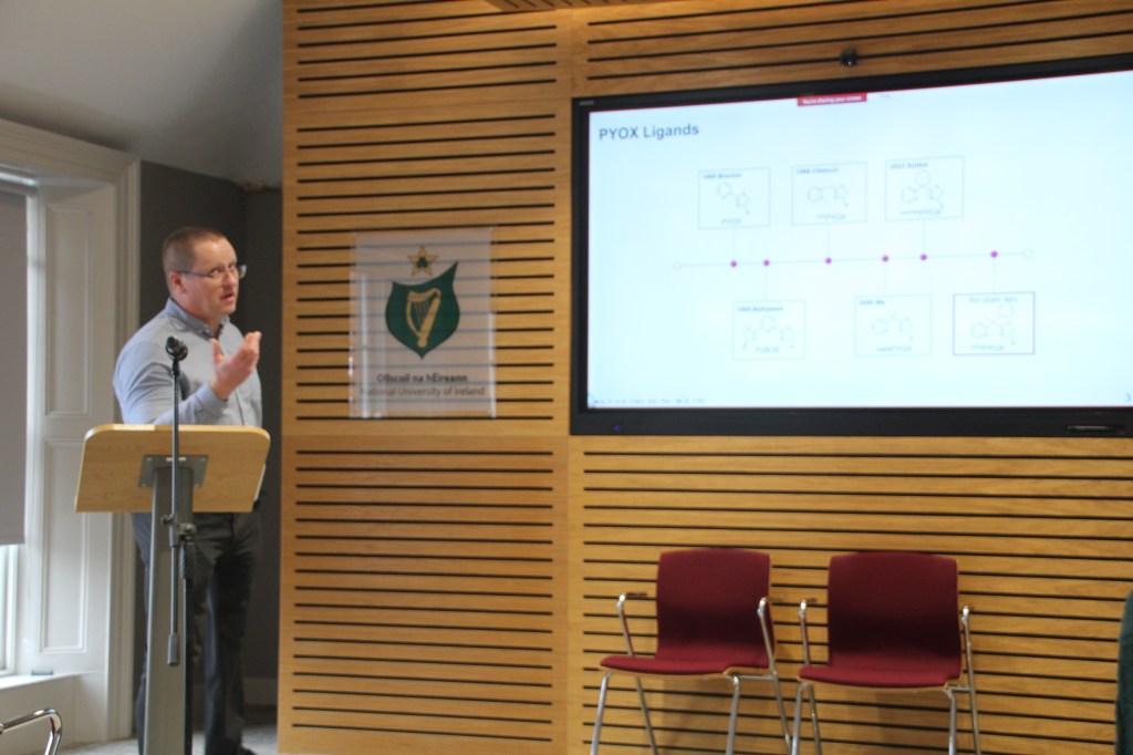 Eoghan Courtney’s presentation began with an overview of the research into developing a biodegradable microcapsule pesticide product, which he did on placement in Life Scientific. Following that, the synthesis of the substrate and the initial optimization of the Pd-catalyzed DAAA reaction of sulfur-containing heterocycles that is on-going in the Guiry Group (UCD) were discussed. Lastly, the background and project outline for achieving asymmetric Suzuki reaction in the preparation of axially chiral P,N-ligands were provided.